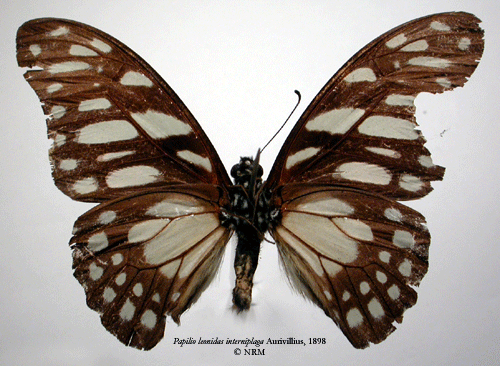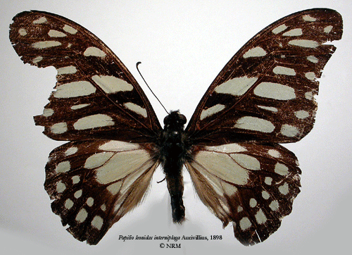 ![]() Papilio leonidas interniplaga Aurivillius, 1898. Reference: Aurivillius, Chr. 1898, Kongliga Svenska Vetenskaps-Akademiens Handlingar, ny följd, Band 31 no: 5. - Rhophalocera Aethiopica, Die Tagfalter des Aethiopischen Faunengebietes, Eine Systematisch-Geographische studie p. 487, P.A. Norstedt & Söner, Stockholm. Return to species-list. |