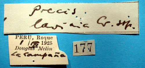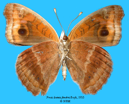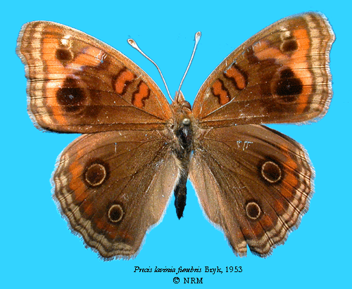 ![]() Precis lavinia funebris Bryk, 1953. Reference: Bryk, F. 1953, Lepidoptera aus dem Amazonasgebiete und aus Peru gesammelt von Dr. Douglas Melin und Dr. Abraham Roman. - Arkiv för Zoologi Band 5 nr. 1, Almqvist & Wiksell Boktryckeri, Uppsala. 268 pp. Return to species-list. |