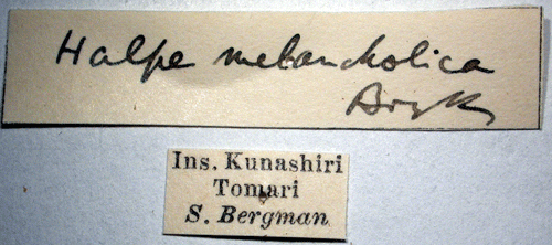 ![]() Halpe melancholica Bryk, 1942. Reference: Bryk, F. 1942, Zur Kenntnis der Grosschmetterlinge der Kurilen (Neue Schmetterlinge aus dem Reichsmuseum in Stockholm VI.). - Deutsche Entomologische Zeitschrift "Iris" Band 56, Dresden. 1 - 90 pp. Mit 2 Tafeln und 4 Textabbildungen. Return to species-list. |