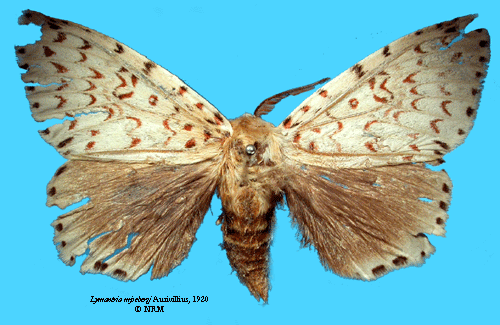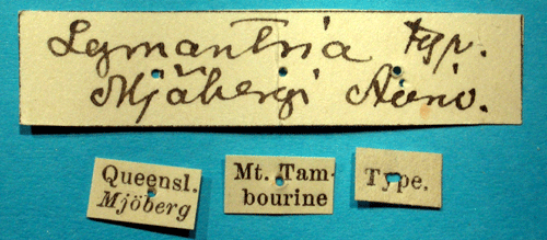 Lymantria mjoebergi Aurivillius, 1920. Reference: Aurivillius, C. 1920, Results of Dr. E. Mjöbergs Swedish Scientific Expeditions to Australia 1910-1913, 21. Macrolepidoptera. - Arkiv för Zoologi Band 13 nr. 2, Almqvist & Wiksells Boktryckeri AB, Uppsala. pp. 1-44, 1 Tafel. Return to species-list. |