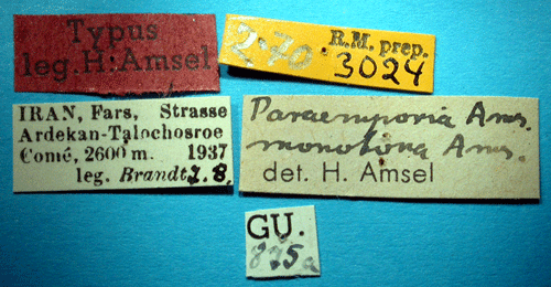 Paraemporia monotona Amsel, 1951. Reference: Amsel, H.G. 1951, Die Microlepidopteren der Brandt'schen Iran-Ausbeute 3. Teil. - Arkiv för Zoologi Band 1 nr. 36, Almqvist & Wiksells Boktryckeri AB, Uppsala. pp. 525-563 Mit 87 Figuren im Text. Return to species-list. |