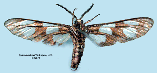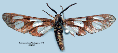 ![]() Syntomis molanna Wallengren, 1875. Reference: Wallengren, H.D.J. 1875, Insecta Transvaaliensia. Bidrag till Transvaalska Republikens i Södra Afrika Insektfauna. - Öfversikt af Kongliga Vatenskaps-Akademiens Förhandllingar, trettiondeandra årgången no: 1. pp 83-137, P. A. Norstedt & Söner, Stockholm. Return to species-list. |