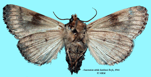 ![]() Anacronicta nitida kurilensis Bryk, 1941. Reference: Bryk, F. 1941, Neue Schmetterlinge aus dem Reichsmuseum in Stockholm. - Entomologisk tidskrift vol 62 H. 3-4, Almqvist & Wiksell Boktryckeri, Uppsala. 141 - 157 pp. Mit 6 Abb. Return to species-list. |