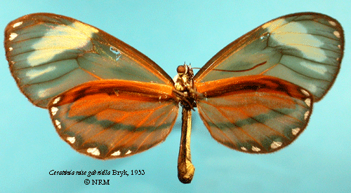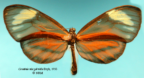 ![]() Ceratinia nise gabriella Bryk, 1953. Reference: Bryk, F. 1953, Lepidoptera aus dem Amazonasgebiete und aus Peru gesammelt von Dr. Douglas Melin und Dr. Abraham Roman. - Arkiv för Zoologi Band 5 nr. 1, Almqvist & Wiksell Boktryckeri, Uppsala. 268 pp. Return to species-list. |