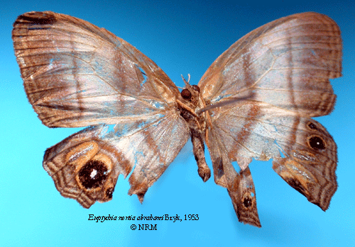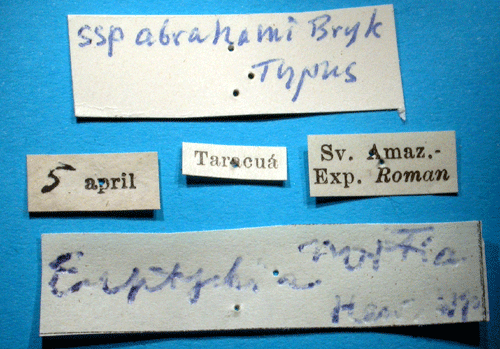 ![]() Euptychia nortia abrahami Bryk, 1953. Reference: Bryk, F. 1953, Lepidoptera aus dem Amazonasgebiete und aus Peru gesammelt von Dr. Douglas Melin und Dr. Abraham Roman. - Arkiv för Zoologi Band 5 nr. 1, Almqvist & Wiksell Boktryckeri, Uppsala. 268 pp. Return to species-list. |