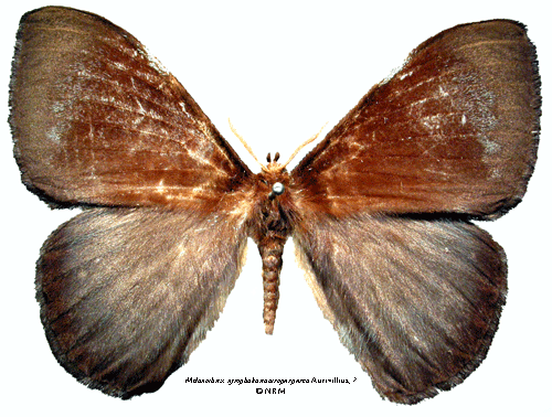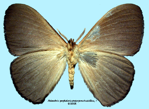 ![]() Melanothrix nymphaliaria atropurpurea Aurivillius, ?. Reference: Strand, E. 1922, in Seitz, A. Die Grosschmetterlinge der Erde. - Die Indoaustralischen Spinner und Schwärmer Band 10 p. 418, Alfred Kernen Verlag, Stuttgart. Return to species-list. |