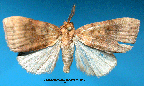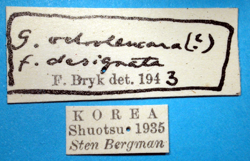 ![]() Gelastocera ochroleucana designata Bryk, 1948. Reference: Bryk, F. 1948, Zur Kenntnis der Großschmetterlinge von Korea. Pars II. Macrofrenatae II (finis): Notodontidae, Lymantriidae, Saturniidae, Brahmaeidae, Drepanidae, Epiplemidae, Lasiocampidae, Arctiidae, Thyatiridae, Noctuidae, Geometridae. Heteroneura: Fam.: Cochlifiidae, Zygaenidae. Tineoidea: Fam.: Cossidae, Psychidae. Mit 7 Tafeln. - Arkiv för Zoologi Band 41 A nr. 1, Almqvist & Wiksell Boktryckeri, Uppsala. 1 - 225 pp. Return to species-list. |