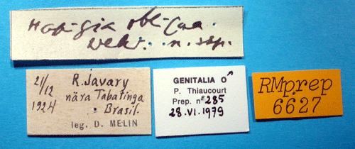 Reference: Bryk, F. 1953, Lepidoptera aus dem Amazonasgebiete und aus Peru gesammelt von Dr. Douglas Melin und Dr. Abraham Roman. - Arkiv för Zoologi Band 5 nr. 1, Almqvist & Wiksell Boktryckeri, Uppsala. 268 pp.