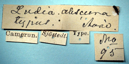 Ludia obscura Aurivillius, 1893. Reference: Aurivillius, C. 1893, Diagnosen neuer Lepidopteren aus Afrika. - Entomologisk tidskrift vol 14, Iduns Kongl. Hofboktryckeri, Stockholm. pp. 199-214. Return to species-list. |