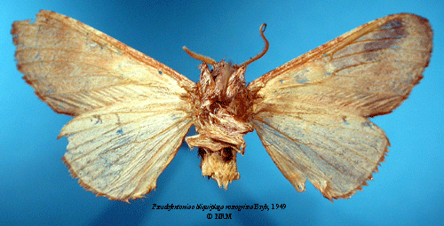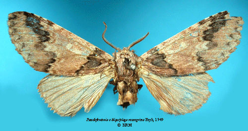 ![]() Pseudofentonia obliquiplaga roseogrisea Bryk, 1949. Reference: Bryk, F. 1949, Entomological Results from the Swedish Expedition 1934 to Burma and British India. Lepidoptera: Notodontidae Stephens, Cossidae Newman and Hepialidae Stephens. Gesammelt von René Malaise. Mit 4 Tafeln und 1 Karte in Text. - Arkiv för Zoologi Band 42 A nr. 19, Almqvist & Wiksell Boktryckeri, Uppsala. 1 - 51 pp. Return to species-list. |