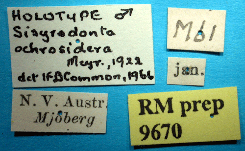 Sisyrodonta ochrosidera Meyrick, 1922. Reference: Meyrick, Edw. 1922, Results of Dr. E. Mjöbergs Swedish Scientific Expedition to Australia 1910-1913. 27. Microlepidoptera. - Arkiv för Zoologi Band 14 nr. 15, Almqvist & Wiksells Boktryckeri AB, Uppsala. pp. 1-13. Return to species-list. |