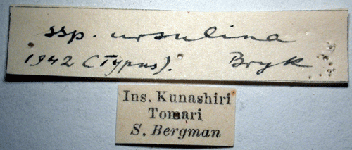 Reference: Bryk, F. 1942, Zur Kenntnis der Grosschmetterlinge der Kurilen (Neue Schmetterlinge aus dem Reichsmuseum in Stockholm VI.). - Deutsche Entomologische Zeitschrift "Iris" Band 56, Dresden. 1 - 90 pp. Mit 2 Tafeln und 4 Textabbildungen.