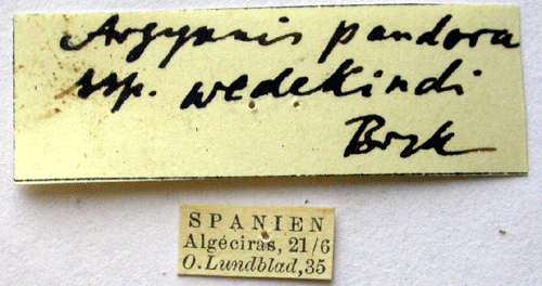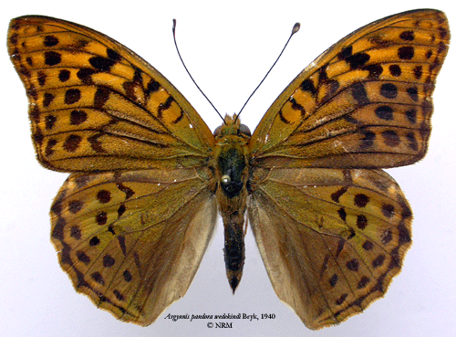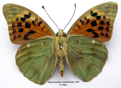 ![]() Argynnis pandora wedekindi Bryk, 1940. Reference: Bryk, F. 1940, Die von Prof. Dr. Lundblad Gesammelten Grosssmetterlinge der Iberischen Halbinsel. - Arkiv för Zoologi Band 32 A nr. 22, Almqvist & Wiksell Boktryckeri, Uppsala. 1 - 36 pp. Mit 7 Tafeln. Return to species-list. |