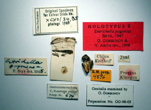 ![]() Entrichella pogonias Bryk, 1947. Reference: Bryk, F. 1947, Neue ostasiatiche Aegeriiden (Lep.). Mit einer Abbildung. - Opuscula Entomologica Band XII, Berlingska Boktryckeriet, Lund. 96 - 109 pp. Return to species-list. |