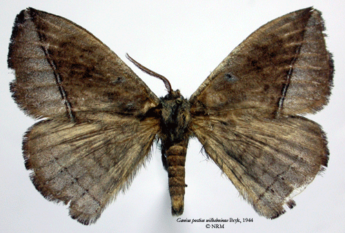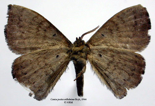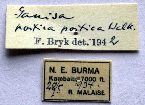 ![]() Ganisa postica wilhelminae Bryk, 1944. Reference: Bryk, F. 1944, Entomological Resuls from the Swedish Expedition 1934 to Burma and British India. Lepidoptera: Saturniidae, Bombycidae, Eupterotidae, Uranidae, Epiplemidaeund Sphingidae. Mit 6 Tafeln und 1 Karte. - Arkiv för Zoologi Band 35 A nr. 8, Almqvist & Wiksell Boktryckeri, Uppsala. 1 - 55 pp. Return to species-list. |