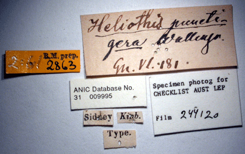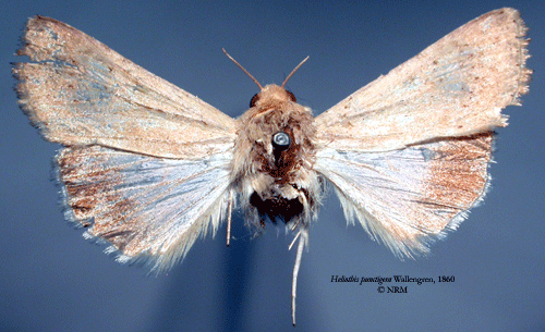 ![]() Heliothis punctigera Wallengren, 1860. Reference: Wallengren, H.D.J. 1860, Lepidopterologische Mittheilungen. - Wiener Entomologische Monatschrift Band IV Nr. 6, Karl Ueberreuter, Alservorstadt. pp 161-176. Return to species-list. |