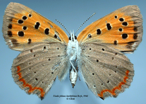 ![]() Heodes phlaeas kuriliphlaeas Bryk, 1942. Reference: Bryk, F. 1942, Zur Kenntnis der Grosschmetterlinge der Kurilen (Neue Schmetterlinge aus dem Reichsmuseum in Stockholm VI.). - Deutsche Entomologische Zeitschrift "Iris" Band 56, Dresden. 1 - 90 pp. Mit 2 Tafeln und 4 Textabbildungen. Return to species-list. |