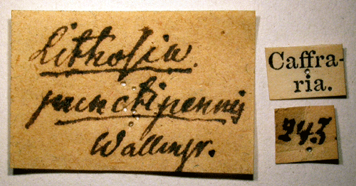 ![]() Lithosia punctipennis Wallengren, 1860. Reference: Wallengren, H.D.J. 1860, Lepidopterologische Mittheilungen. - Wiener Entomologische Monatschrift Band IV Nr. 2, Karl Ueberreuter, Alservorstadt. pp 33-46. Return to species-list. |