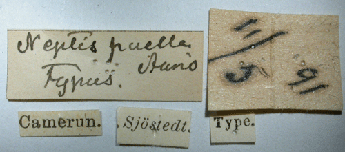 ![]() Neptis puella Aurivillius, 1894. Reference: Aurivillius, Chr. 1894, Beiträge zur Kenntniss der Insektenfauna von Kamerun. - Entomologisk tidskrift Årg. 15 pp. 273-314, Iduns tryckeri AB, Stockholm. Return to species-list. |