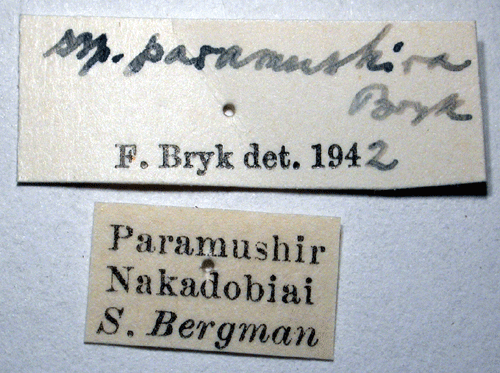 ![]() Parasemia plantaginis paramushira Bryk, 1942. Reference: Bryk, F. 1942, Zur Kenntnis der Grosschmetterlinge der Kurilen (Neue Schmetterlinge aus dem Reichsmuseum in Stockholm VI.). - Deutsche Entomologische Zeitschrift "Iris" Band 56, Dresden. 1 - 90 pp. Mit 2 Tafeln und 4 Textabbildungen. Return to species-list. |