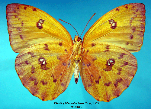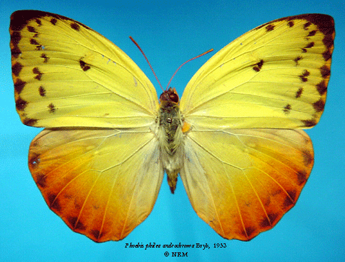 ![]() Phoebis philea androchroma Bryk, 1953. Reference: Bryk, F. 1953, Lepidoptera aus dem Amazonasgebiete und aus Peru gesammelt von Dr. Douglas Melin und Dr. Abraham Roman. - Arkiv för Zoologi Band 5 nr. 1, Almqvist & Wiksell Boktryckeri, Uppsala. 268 pp. Return to species-list. |