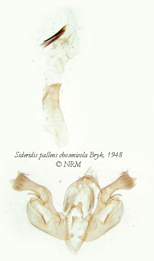 ![]() Sideridis pallens chosenicola Bryk, 1948. Reference: Bryk, F. 1948, Zur Kenntnis der Großschmetterlinge von Korea. Pars II. Macrofrenatae II (finis): Notodontidae, Lymantriidae, Saturniidae, Brahmaeidae, Drepanidae, Epiplemidae, Lasiocampidae, Arctiidae, Thyatiridae, Noctuidae, Geometridae. Heteroneura: Fam.: Cochlifiidae, Zygaenidae. Tineoidea: Fam.: Cossidae, Psychidae. Mit 7 Tafeln. - Arkiv för Zoologi Band 41 A nr. 1, Almqvist & Wiksell Boktryckeri, Uppsala. 1 - 225 pp. Return to species-list. |