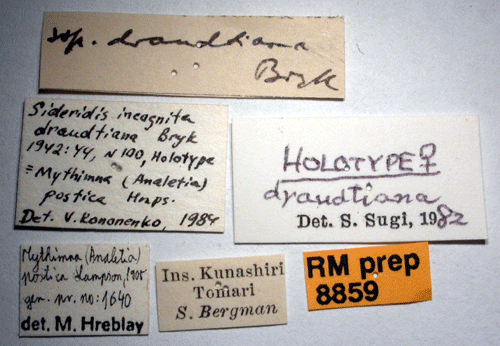 ![]() Sideridis postica draudtiana Bryk, 1942. Reference: Bryk, F. 1942, Zur Kenntnis der Grosschmetterlinge der Kurilen (Neue Schmetterlinge aus dem Reichsmuseum in Stockholm VI.). - Deutsche Entomologische Zeitschrift "Iris" Band 56, Dresden. 1 - 90 pp. Mit 2 Tafeln und 4 Textabbildungen. Return to species-list. |