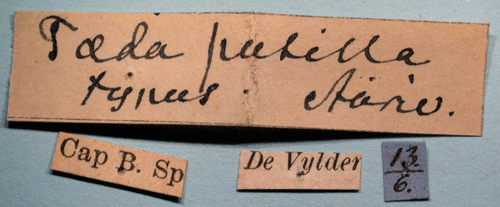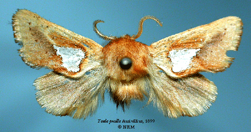 Taeda pusilla Aurivillius, 1899. Reference: Aurivillius, C. 1899, Diagnosen neuer Lepidopteren aus Afrika 5. - Entomologisk tidskrift vol 20, Iduns Kongl. Hofboktryckeri, Stockholm. pp. 233-258. Return to species-list. |
