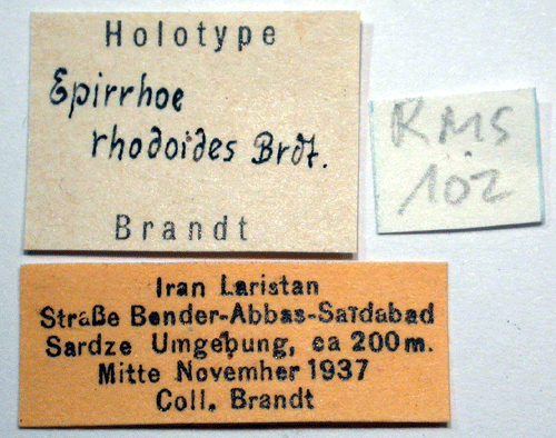 Epirrhoe rhodoides Brandt, 1941. Reference: Brandt, W. 1941, Beitrag zur Lepidopteren-Fauna von Iran (4). Einige neue Geometriden. - Mitteilungen der Münchner Entomologischen Gesellschaft 31, München. pp. 864-886. Return to species-list. |