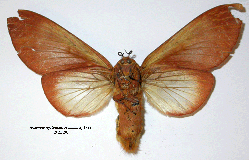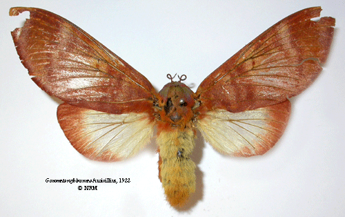 ![]() Gonometa rufobrunnea Aurivillius, 1922. Reference: Aurivillius, Chr. 1922. New forms of Lasiocampidae from the Transvaal Museum. - Annals of the Transvaal Museum volume 9 part II, pp. 139-141, University Press Cambridge. Return to species-list. |