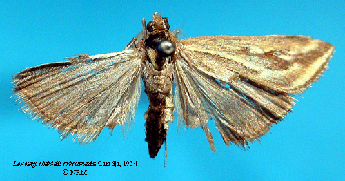 Loxostege rhabdalis rubrotinctalis Caradja, 1934. Reference: Caradja, A. 1934, Swedish-chinesische wissenschaftliche Expedition nach den nordwestlichen Provinzen Chinas, unter Leitung von Dr. Sven Hedin und Prof. Sü Ping-chang. Insekten. gesammelt vom schwedischen Arzt der Expedition Dr. David Hummel 1927-1930. 22.Lepidoptera 3. Familiae: Pyralidae, Pterophoridae, Tortricidae-Tineidae l. s. - Arkiv för Zoologi Band 27 A nr. 8. Almqvist & Wiksells Boktryckeri AB, Uppsala. pp. 1-10. Return to species-list. |