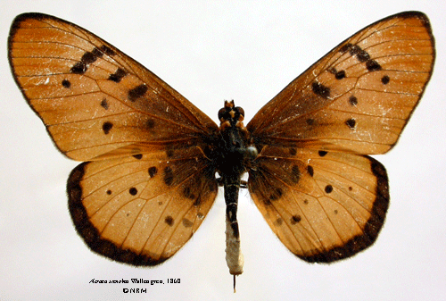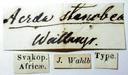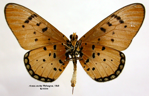 ![]() Acraea stenobea Wallengren, 1860. Reference: Wallengren, H.D.J. 1860, Lepidopterologische Mittheilungen. - Wiener Entomologische Monatschrift Band IV Nr. 2, Karl Ueberreuter, Alservorstadt. pp 33-46. Return to species-list. |