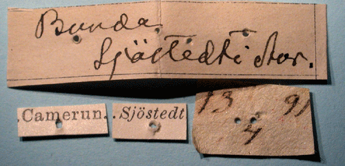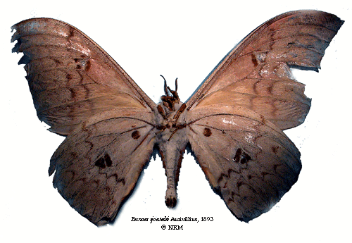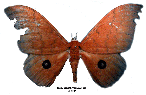 Bunaea sjoestedti Aurivillius, 1893. Reference: Aurivillius, C. 1893, Diagnosen neuer Lepidopteren aus Afrika. - Entomologisk tidskrift vol 14, Iduns Kongl. Hofboktryckeri, Stockholm. pp. 199-214. Return to species-list. |