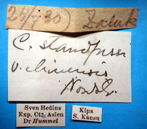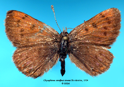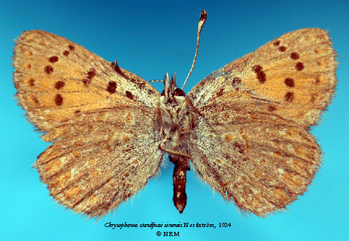 Chrysophanus standfussi sinensis Nordström, 1934. Reference: Nordström, F. 1934, Swedish-chinesische wissenschaftliche Expedition nach den nordwestlichen Provinzen Chinas, unter Leitung von Dr. Sven Hedin und Prof. Sü Ping-chang. Insekten. gesammelt vom schwedischen Arzt der Expedition Dr. David Hummel 1927-1930. 21.Lepidoptera 1. Diurna. 2. Sphinges. - Arkiv för Zoologi Band 27 A nr. 7, Mit 2 Tafeln. Almqvist & Wiksells Boktryckeri AB, Uppsala. pp. 1-37. Return to species-list. |