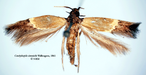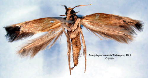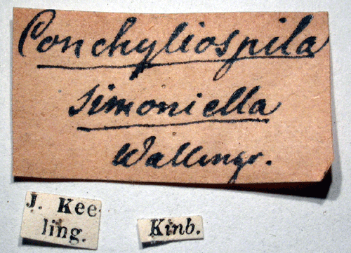 ![]() Conchyliospila simoniella Wallengren, 1861. Reference: Wallengren, H.D.J. 1861, Kongliga Svenska Fregatten Eugenies resa omkring jorden under befäl af C. A. Virgin. Åren 1851 - 1853. - Vetenskapliga iakttagelser på H. Maj:t Konung Oscar den Förstes befallning utgifna af K. Svenska Vetenskaps-Akademien. Andra delen Zoologi 1. Insecta. Almqvist & Wiksells Boktryckeri, Uppsala & Stockholm. pp. 351 - 390. Return to species-list. |