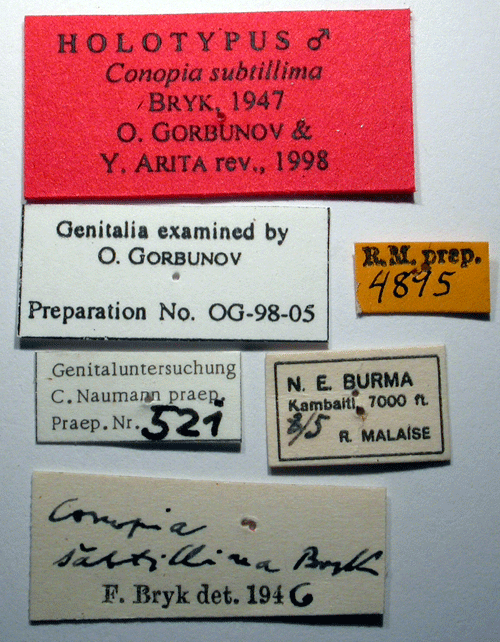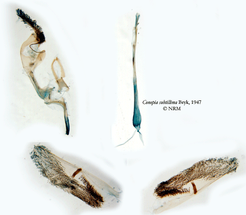 ![]() Conopia subtillima Bryk, 1947. Reference: Bryk, F. 1947, Neue ostasiatiche Aegeriiden (Lep.). Mit einer Abbildung. - Opuscula Entomologica Band XII, Berlingska Boktryckeriet, Lund. 96 - 109 pp. Return to species-list. |