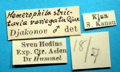 Hemerophila strictaria variegata Djakonov, 1936. Reference: Djakonov, A. 1936, Swedish-chinesische wissenschaftliche Expedition nach den nordwestlichen Provinzen Chinas, unter Leitung von Dr. Sven Hedin und Prof. Sü Ping-chang. Insekten. gesammelt vom schwedischen Arzt der Expedition Dr. David Hummel 1927-1930. 57. Lepidoptera 5. Geometridae. - Arkiv för Zoologi Band 27 A nr. 32. Almqvist & Wiksells Boktryckeri AB, Uppsala. pp. 1-67. Return to species-list. |