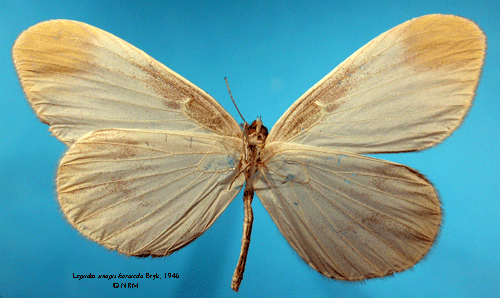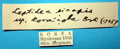 ![]() Leptidea sinapis koraicola Bryk, 1946. Reference: Bryk, F. 1946, Zur Kenntnis der Großschmetterlinge von Korea. Pars I. Rhopalocera, Hesperiodea et Macrofrenatae I Sphingidae. Mit 5 Tafeln und 1 Karte. - Arkiv för Zoologi Band 38 A nr. 3, Almqvist & Wiksell Boktryckeri, Uppsala. 1 - 74 pp. Return to species-list. |