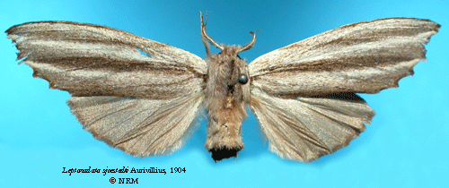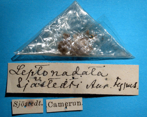 Leptonadata sjoestedti Aurivillius, 1904. Reference: Aurivillius, C. 1904, Beiträge zur Kenntnis der Insektenfauna von Kamerun, N:o 11, Lepidoptera Heterocera. - Arkiv för Zoologi Band 2 nr. 4, Kungl. Boktryckeriet P.A. Norstedt & Söner, Stockholm. pp. 1-68 Mit 51 Textfiguren, 1 Tafel. Return to species-list. |