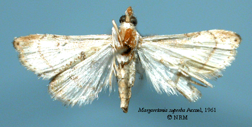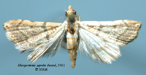 Margaretania superba Amsel, 1961. Reference: Amsel, H.G. 1961, Die Microlepidopteren der Brandt'schen Iran-Ausbeute 5. Teil. - Arkiv för Zoologi Band 13 nr. 17, Almqvist & Wiksells Boktryckeri AB, Uppsala. pp. 323-445 Mit 263 Abbildungen. Return to species-list. |