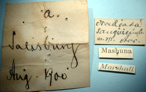 Nadiasa sanguicincta Aurivillius, 1901. Reference: Aurivillius, C. 1901, Diagnosen neuer Lepidopteren aus Afrika 6. - Entomologisk tidskrift vol 22, Iduns Kongl. Hofboktryckeri, Stockholm. pp. 113-128. Return to species-list. |