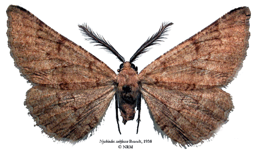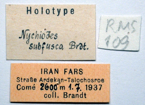 Nychiodes subfusca Brandt, 1938. Reference: Brandt, W. 1938, Beitrag zur Lepidopteren-Fauna von Iran. Neue Gattungen, Arten und Formen. - Entomologische Rundschau Jahrgang 55, Stuttgart. p. 598. Return to species-lat. |