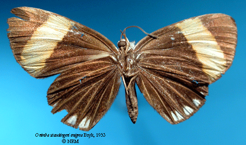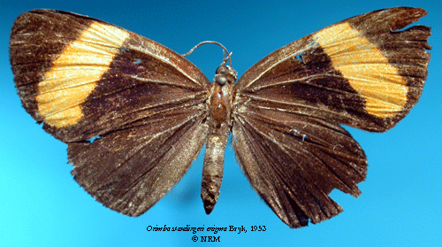 ![]() Orimba staudingeri enigma Bryk, 1953. Reference: Bryk, F. 1953, Lepidoptera aus dem Amazonasgebiete und aus Peru gesammelt von Dr. Douglas Melin und Dr. Abraham Roman. - Arkiv för Zoologi Band 5 nr. 1, Almqvist & Wiksell Boktryckeri, Uppsala. 268 pp. Return to species-list. |
