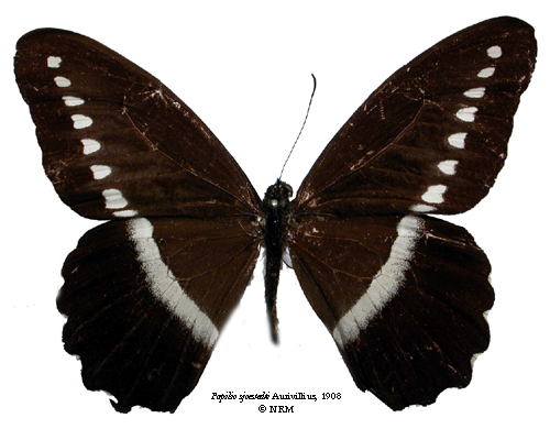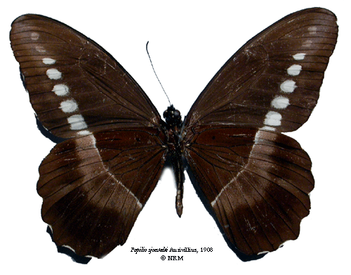 ![]() Papilio sjoestedti Aurivillius, 1908. Reference: Aurivillius, Chr. 1908, in Seitz, A. Die Grosschmetterlinge der Erde. - Die Afrikanischen Tagfalter Band 13 p. 15, Alfred Kernen Verlag, Stuttgart. Return to species-list. |