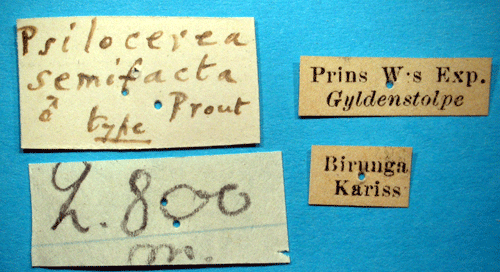 Psilocerea semifacta Prout, 1926. Reference: Prout, L.B. 1926, Zoological Results of the Swedish Expedition to Central Africa 1921. Insecta 20. Lepidoptera, Geometridae. - Arkiv för Zoologi Band 18 A nr. 25, Almqvist & Wiksells Boktryckeri AB, Uppsala. pp. 1-17. Return to species-list. |