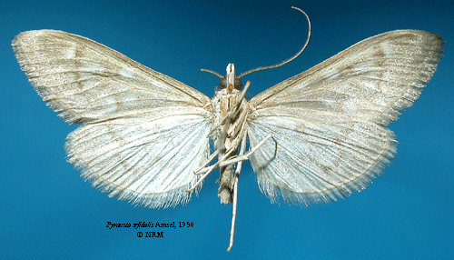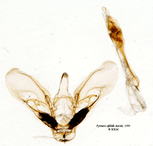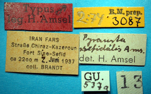 Pyrausta sefidalis Amsel, 1950. Reference: Amsel, H.G. 1950, Die Microlepidopteren der Brandt'schen Iran-Ausbeute 2. Teil. - Arkiv för Zoologi Band 1 A nr. 17, Almqvist & Wiksells Boktryckeri AB, Uppsala. pp. 223-257 Mit 84 Figuren im Text. Return to species-list. |