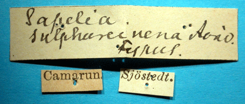 Sapelia sulphureivena Aurivillius, 1904. Reference: Aurivillius, C. 1904, Beiträge zur Kenntnis der Insektenfauna von Kamerun, N:o 11, Lepidoptera Heterocera. - Arkiv för Zoologi Band 2 nr. 4, Kungl. Boktryckeriet P.A. Norstedt & Söner, Stockholm. pp. 1-68 Mit 51 Textfiguren, 1 Tafel. Return to species-list. |