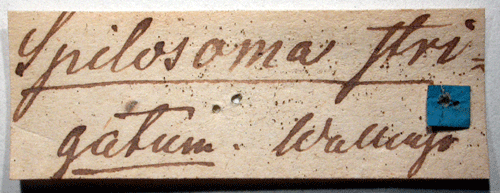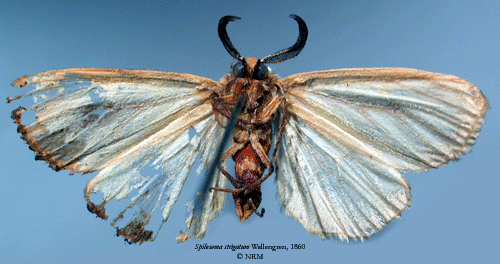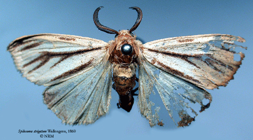 ![]() Spilosoma strigatum Wallengren, 1860. Reference: Wallengren, H.D.J. 1860, Lepidopterologische Mittheilungen. - Wiener Entomologische Monatschrift Band IV Nr. 6, Karl Ueberreuter, Alservorstadt. pp 161-176. Return to species-list. |