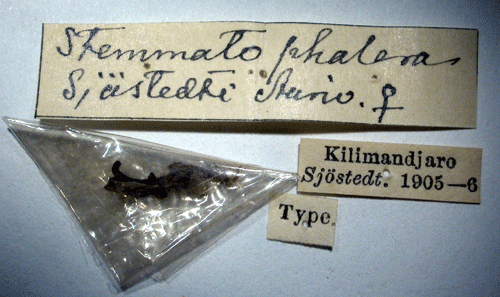 ![]() Stemmatophalera sjoestedti Aurivillius, 1910. Reference: Aurivillius, Chr. 1910, in Sjöstedt, Y. Wissenschaftliche Ergebnisse der Swedischen Zoologischen Expedition nach dem Kilimandjaro, dem Meru und den Umgebenden Masaisteppen Deutsch-Ostafrikas 1905-1906 2 Band. - 9. Lepidoptera pp. 1-56, P. Palmquist AB., Stockholm. Return to species-list. |