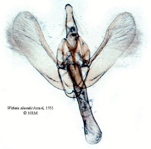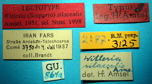 Witlesia silacealis Amsel, 1951. Reference: Amsel, H.G. 1951, Die Microlepidopteren der Brandt'schen Iran-Ausbeute 3. Teil. - Arkiv för Zoologi Band 1 nr. 36, Almqvist & Wiksells Boktryckeri AB, Uppsala. pp. 525-563 Mit 87 Figuren im Text. Return to species-list. |